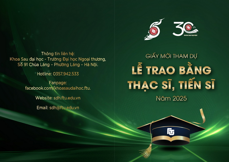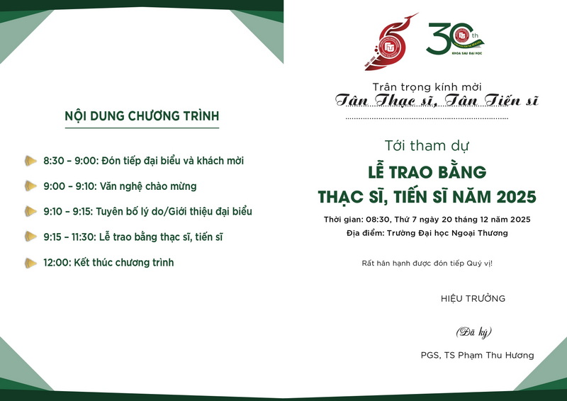 Nhà trường xin trân trọng kính mời các Tân thạc sĩ, các Tân tiến sĩ cùng gia đình và cơ quan công tác của mình tới tham dự Lễ trao bằng Thạc sĩ, Tiến sĩ năm 2025 được tổ chức vào Thứ Bảy, ngày 20/12/2025 tại Trường Đại học Ngoại thương.