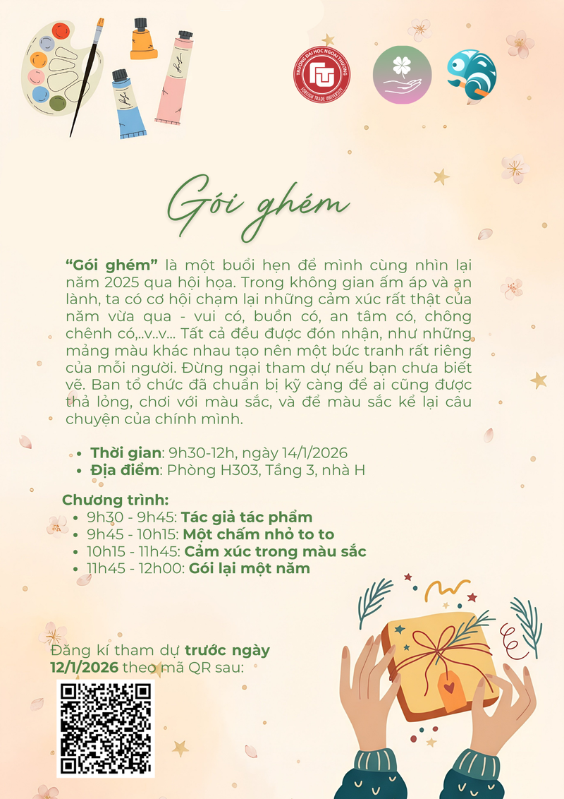 Năm 2025 đã trôi qua với nhiều giờ giảng, nhiều đầu việc và không ít trách nhiệm, đôi khi khiến chúng ta có rất ít khoảng dừng cho chính mình. “Trong nắng trong” là một buổi hẹn nhỏ do Ban Dự án “Chạm và Hiểu” và Câu lạc bộ Mỹ thuật Trường Đại học Ngoại Thương triển khai, nơi mang đến không gian để cán bộ, giảng viên Nhà trường có thể tạm rời khỏi vai trò quen thuộc, cùng ngồi xuống để nhìn lại năm qua theo một cách nhẹ nhàng và an lành hơn.