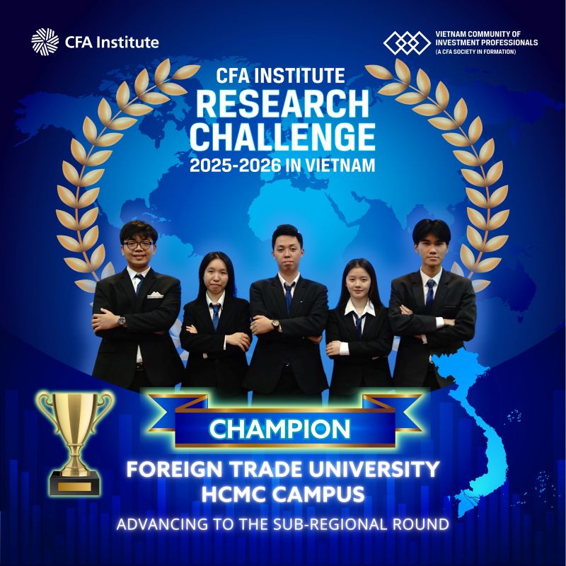 Ngày 20/12/2025, 02 đội thi của Trường ĐH Ngoại Thương (01 đội của Trụ sở chính Hà Nội và 01 đội đến từ Cơ sở II tại TP. Hồ Chí Minh) đã tham dự vòng chung kết toàn quốc Cuộc thi CFA Institute Research Challenge tại Việt Nam 2025 - 2026 tại TP. Hồ Chí Minh.