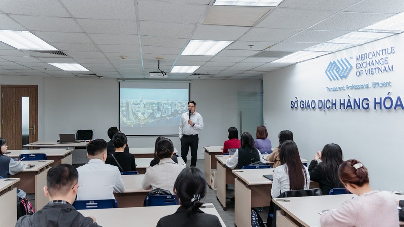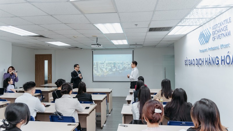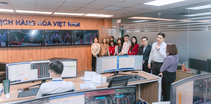 Tiếp đó, ngày 4/12/2025, đoàn học viên có chuyến tham quan Công ty Cổ phần Chứng khoán VPS, nơi ông Uông Văn Quang - Chuyên viên cao cấp tư vấn phái sinh, trực tiếp hướng dẫn giao dịch hợp đồng tương lai VN30 trên tài khoản demo, giúp học viên kết nối kiến thức lý thuyết với diễn biến thị trường trong thời gian thực. Chuỗi trải nghiệm khép lại vào ngày 8/12/2025 với chuyến tham quan Sở Giao dịch Hàng hóa Việt Nam (MXV), nơi bà Đoàn Thị Giang - Chuyên viên Khối Quản lý Giao dịch, hướng dẫn học viên giao dịch hợp đồng phái sinh hàng hóa trên nền tảng CQG – một công cụ chuyên nghiệp đang được sử dụng rộng rãi trên thị trường.