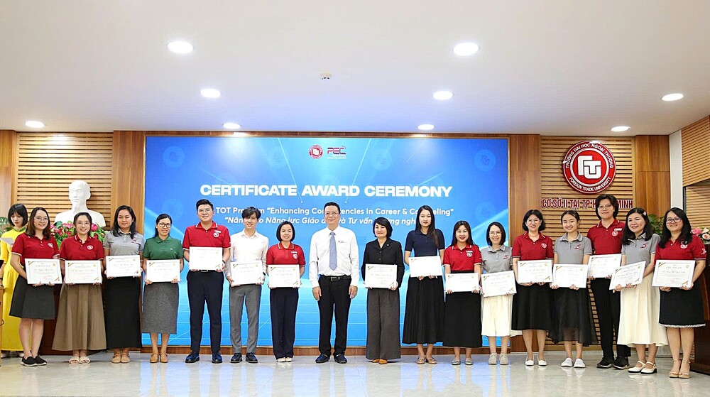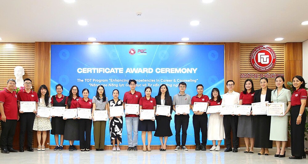 Ngày 12/01/2026, Trung tâm Thực hành Nghề nghiệp (PEC), Trường Đại học Ngoại Thương với sự hỗ trợ của Ban Tổ chức - Hành chính, Cơ sở II tại TP. Hồ Chí Minh tổ chức Lễ trao chứng nhận “FTU - Nhà đồng hành hướng nghiệp thế hệ mới” dành cho các cán bộ, giảng viên hoàn thành Khóa đào tạo TOT02HCM “Nâng cao năng lực giáo dục và tư vấn hướng nghiệp” tại TP. Hồ Chí Minh.