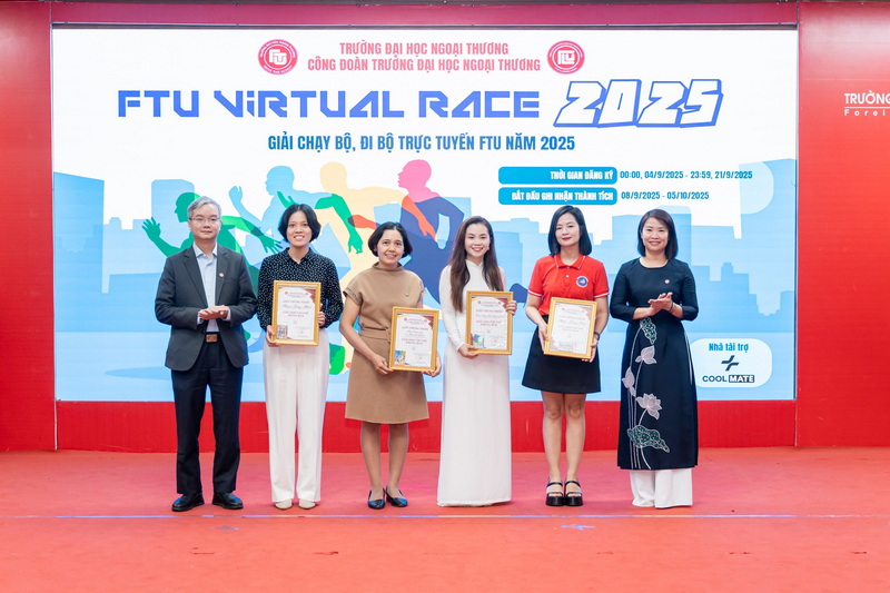 Nhân dịp Chào mừng Ngày Truyền thống trường Đại học Ngoại thương 15/10/2025, Nhà trưởng tổ chức trao tặng các danh hiệu thi đua và khen thưởng cho các tập thể và cá nhân năm 2024. Trao Giải các tập thể, cá nhân đạt thành tích xuất sắc tại “FTU Virtual Race 2025”- Giải chạy bộ, đi bộ trực tuyến FTU năm 2025. Đại diện Công đoàn Trường và Phòng TT&QHĐN tặng hoa và quà tri ân đại diện Fastech Asia (nhãn hàng Coolmate) - Nhà tài trợ quà tặng hiện vật cho “FTU Virtual Race 2025” - Giải chạy bộ, đi bộ trực tuyến FTU năm 2025. Hướng đến chào mừng 65 năm thành lập trường Đại học Ngoại Thương, Công đoàn trường ĐH Ngoại Thương phát động phong trào “Green corner-Green University” với thông điệp “Hành động nhỏ- Ý nghĩa lớn” cho ngôi trường FTU “Xanh – Hạnh phúc”.
