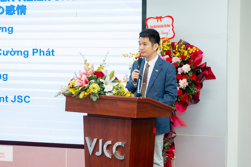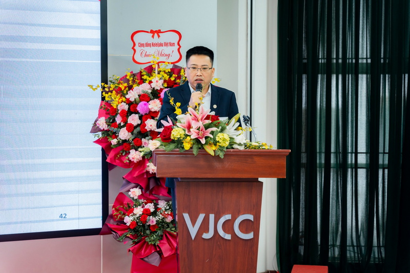Phát biểu mở đầu buổi lễ, PGS.TS Nguyễn Thị Hiền – Viện trưởng VJCC – đã giới thiệu tổng quát về Chương trình Keieijuku, nhấn mạnh sứ mệnh của Chương trình Keieijuku trong việc phát triển đội ngũ lãnh đạo doanh nghiệp Việt Nam theo tinh thần quản trị Nhật Bản, góp phần nâng cao năng lực quản trị toàn diện và thúc đẩy giao lưu kinh tế – văn hóa giữa hai quốc gia. Cô khẳng định năm giá trị cốt lõi làm nên thương hiệu Keieijuku gồm: nội dung đào tạo hệ thống và đổi mới; đội ngũ giảng viên tinh hoa Nhật – Việt; quy trình tuyển chọn nghiêm ngặt; chất lượng uy tín; và mạng lưới hợp tác bền vững giữa các tổ chức, doanh nghiệp và chuyên gia. Nhân dịp này, PGS.TS. Nguyễn Thị Hiền gửi lời cảm ơn sâu sắc và mong muốn tiếp tục nhận được sự hỗ trợ đồng hành từ Đại sứ quán Nhật Bản, các tổ chức JICA, JETRO, JCCI cùng các doanh nghiệp, đối tác và cộng đồng Keieijuku Việt Nam.