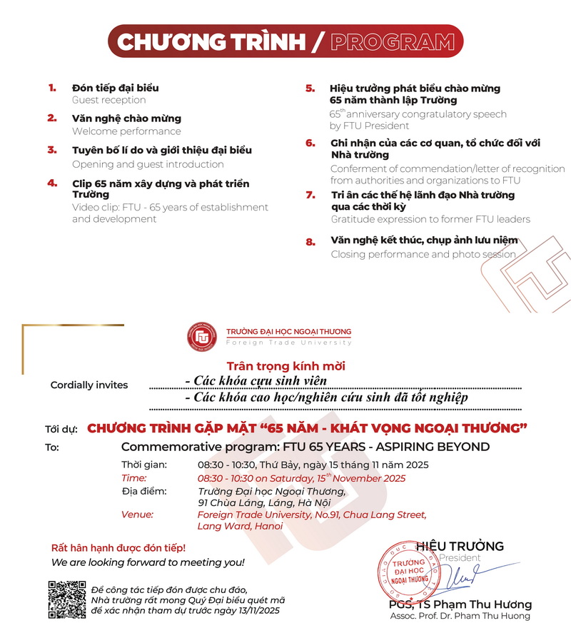 Ngày 15/11/2025, Trường Đại học Ngoại Thương trang trọng tổ chức Chương trình Gặp mặt "65 năm - Khát vọng Ngoại Thương" tại Trụ sở chính Hà Nội (91 phố Chùa Láng - phường Láng - TP Hà Nội), với sự chân thành và những tình cảm tốt đẹp nhất, Hiệu trưởng Trường Đại học Ngoại Thương đã ký Thư mời, trân trọng kính mời và bày tỏ mong muốn được đón tiếp các thế hệ Người Ngoại Thương ở cả 3 cơ sở cùng nhau về dự hội, về Nhà, về bên nhau trong Ngày hội trường, để cùng tiếp thêm cho nhau động lực cho một giai đoạn phát triển mới và cùng nhau chắp cánh cho hình ảnh, uy tín, và thương hiệu "Ngoại Thương" bằng tinh thần đoàn kết, sự tự hào và khát vọng Ngoại Thương.