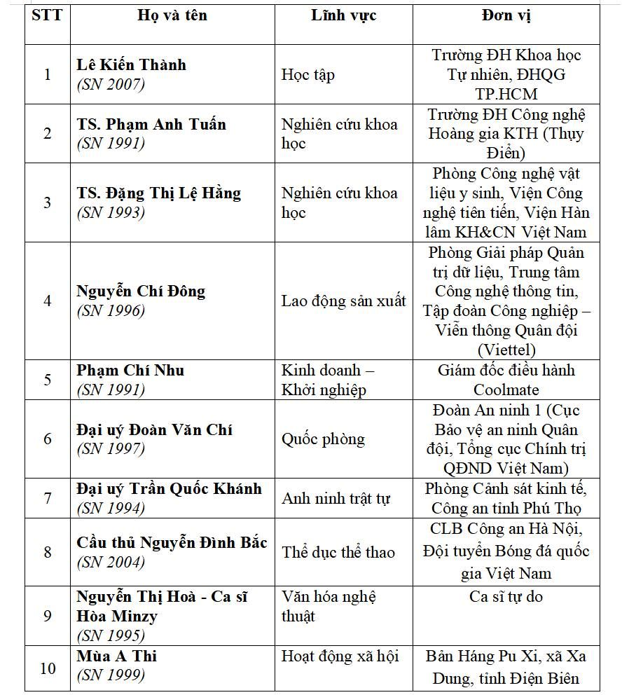 Ban Bí thư Trung ương Đoàn vừa có quyết định công nhận Giải thưởng Gương mặt trẻ Việt Nam tiêu biểu năm 2025 đối với 10 cá nhân có thành tích xuất sắc ở 9 lĩnh vực: Học tập; Nghiên cứu khoa học; Lao động sản xuất; Kinh doanh khởi nghiệp; Quốc phòng; An ninh trật tự; Thể dục thể thao; Văn hoá nghệ thuật; Hoạt động xã hội.