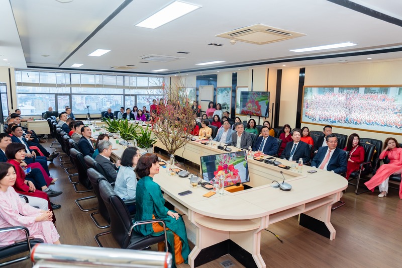 Đón tiếp Đoàn công tác, về phía Nhà trường có PGS, TS Phạm Thu Hương – Bí thư Đảng uỷ, Hiệu trưởng; PGS, TS Lê Thị Thu Thủy – Phó Bí thư Đảng uỷ, Chủ tịch Hội đồng Khoa học và Đào tạo; PGS, TS Đào Ngọc Tiến – Thường vụ Đảng uỷ, Phó Hiệu trưởng; PGS, TS Vũ Thị Hiền – Đảng uỷ viên, Phó Hiệu trưởng; TS Phùng Mạnh Hùng – Chủ tịch Công đoàn Trường, Trưởng Phòng Quản lý Dự án; ThS Đoàn Anh Tuấn – Bí thư Đoàn Thanh niên; ThS Lê Hoàng Liên – Trưởng phòng Hành chính – Tổng hợp; cùng đại diện lãnh đạo các đơn vị trong Trường.
