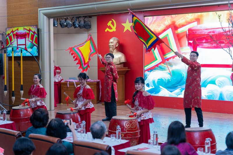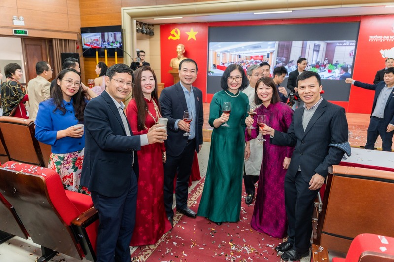 Trong không khí tươi vui chào đón Xuân mới, các thầy cô trong Tập thể lãnh đạo Nhà trường đã gửi những lời chúc đầy ý nghĩa tới các thầy cô cán bộ viên chức Nhà trường cũng như cùng cả Hội trường nâng ly tượng trưng chúc mừng năm mới, gửi gắm những tình cảm, chia sẻ niềm tự hào cũng như thể hiện sự đồng lòng, quyết tâm đạt được những mục tiêu trong chiến lược phát triển đã đề ra.