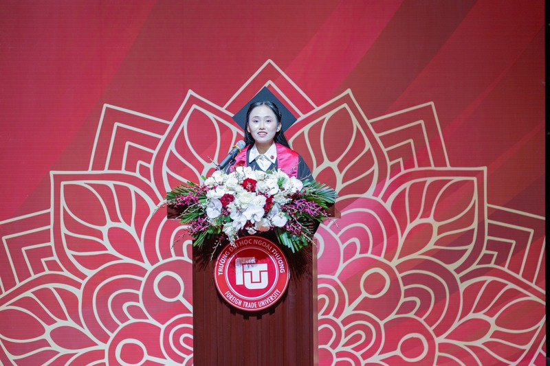 Đại diện cho các tân cử nhân tốt nghiệp đợt này, sinh viên Lương Tùng Chi - Chương trình chất lượng cao kinh tế đối ngoại với Tổng điểm kết quả học tập toàn khoá đạt 3,98/4,0 và Tổng điểm Đánh giá kết quả rèn luyện toàn khóa đạt 96/100 đã bày tỏ niềm vinh dự khi được đại diện cho các tân cử nhân tốt nghiệp đợt 1 năm 2026 chia sẻ cảm xúc cũng như gửi lời tri ân tới thầy cô và gia đình tại buổi lễ. Nhìn lại chặng đường gần 4 năm đại học với nhiều nỗ lực, Tùng Chi nhận định rằng điều soi đường cho mỗi người trên chặng đường phía trước không nên là hào quang thành công của người khác, mà phải là những giá trị bản thân thực sự tin tưởng. Bài phát biểu gửi gắm tinh thần sống sâu sắc, biết quay về lắng nghe chính mình, bền bỉ theo đuổi ước mơ, giữ sự kiên định trước thử thách và trưởng thành từ nội lực được vun đắp bởi gia đình, thầy cô và môi trường học tập tại Trường Đại học Ngoại Thương.