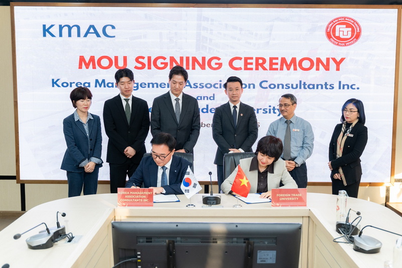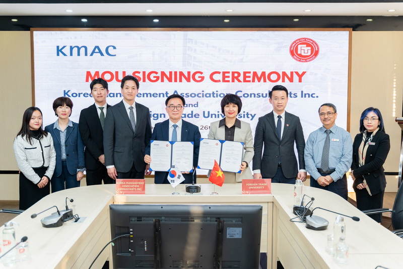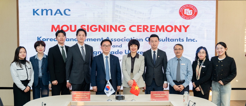 Ngày 26/11/2025, Viện đào tạo và tư vấn Doanh nghiệp, Trường ĐH Ngoại Thương đã phối hợp với Công ty Tư vấn Quản lý Hàn Quốc (KMAC) tổ chức Lễ ký kết Biên bản ghi nhớ hợp tác (MoU) giai đoạn 2026 – 2028 giữa Trường ĐH Ngoại Thương (FTU) và KMAC, đánh dấu bước tiến mới trong quan hệ hợp tác giữa hai bên.