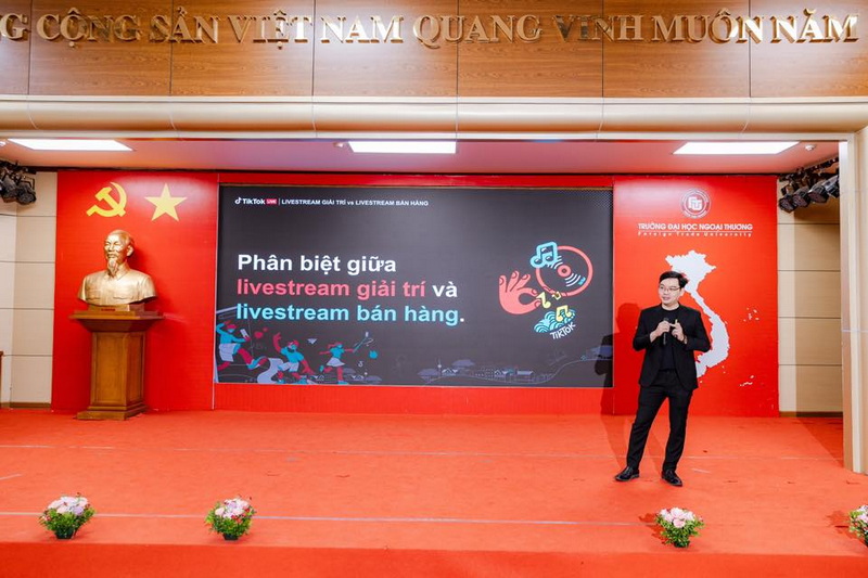 Về phía Trường Đại học Ngoại Thương có sự tham dự của ThS Nguyễn Huyền Minh – Trưởng Phòng Truyền thông và Quan hệ đối ngoại; ThS Đinh Thủy Tiên – Phó Bí thư phụ trách Đoàn Thanh niên Trường; cùng các bạn sinh viên Ngoại Thương cũng như các bạn trẻ quan tâm đến lĩnh vực truyền thông, sáng tạo nội dung và kinh tế số. Phát biểu tại lễ khai mạc, ThS Nguyễn Huyền Minh – Trưởng Phòng Truyền thông và Quan hệ đối ngoại cho biết, Trường ĐH Ngoại Thương tự hào là một trong những trường đại học công lập hàng đầu chú trọng việc kết nối hợp tác với Doanh nghiệp và Nhà trường. Các chuyên gia từ doanh nghiệp trong và ngoài nước được Nhà trường mời tới chia sẻ, kết nối hoạt động đào tạo với sinh viên. Trên cơ sở hợp tác với Trung tâm Hỗ trợ Thanh niên Khởi nghiệp Việt Nam (SYS) – trực thuộc Trung ương Hội Liên hiệp Thanh niên Việt Nam và TikTok LIVE Việt Nam, chương trình TIKTOK UNITOUR tại Trường ĐH Ngoại Thương kỳ vọng mang đến không gian lan tỏa tư duy tích cực, định hướng nghề nghiệp bền vững và trách nhiệm xã hội cho thế hệ sinh viên Việt Nam Buổi sáng mở đầu với phiên đào tạo chuyên sâu từ chuyên gia TikTok LIVE - Ông Ethan Nguyễn – Giám đốc Sáng tạo TikTok LIVE Việt Nam, mang đến cho sinh viên cái nhìn toàn diện về nền tảng TikTok Live và mô hình TCN (TikTok Creator Network) – hệ sinh thái hỗ trợ các nhà sáng tạo phát triển bền vững. Phiên buổi sáng cũng có sự tham gia chia sẻ của TikToker Thảo Anh.