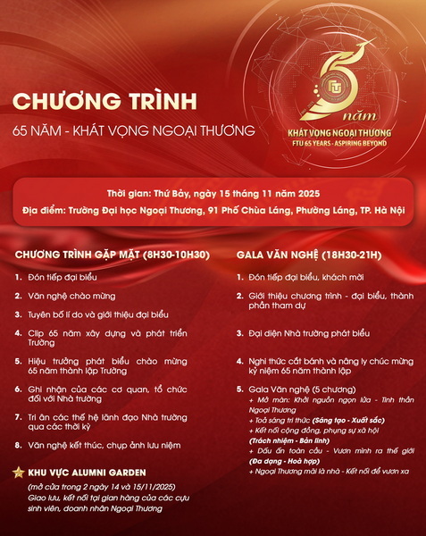 Vui lòng theo dõi thêm các chương trình chào mừng kỷ niệm 65 năm thành lập Trường Đại học Ngoại Thương tại: https://ftu.edu.vn/ky-niem-65-nam
