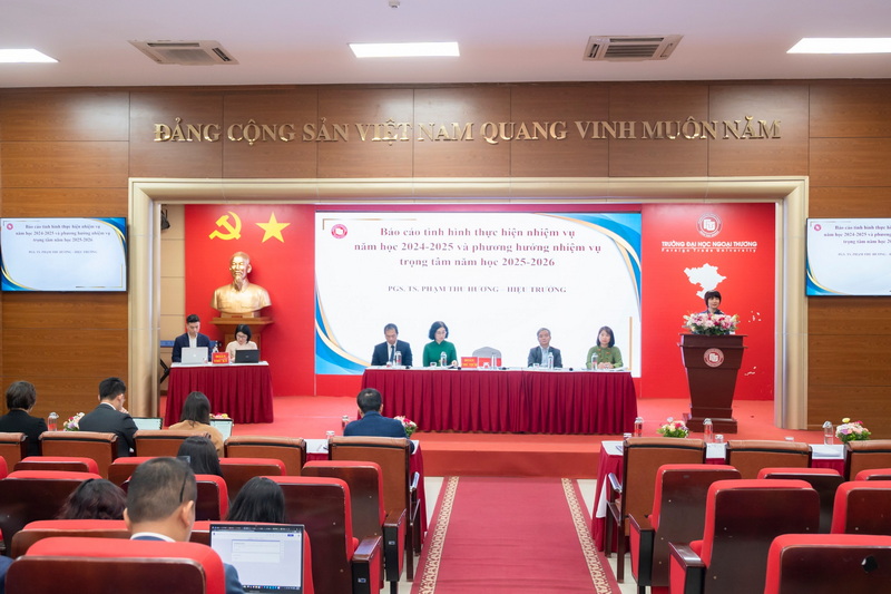 Mở đầu hội nghị ,PGS, TS Phạm Thu Hương, Bí thư Đảng ủy, Hiệu trưởng Nhà trường lên Báo cáo tình hình thực hiện nhiệm vụ năm học 2024-2025 và phương hướng nhiệm vụ trọng tâm năm học 2025-2026 của Nhà trường; Báo cáo kiểm điểm trách nhiệm của người đứng đầu trong việc thực hiện kế hoạch công tác năm học 2024-2025. Các báo cáo đã điểm lại những kết quả, thành tựu nổi bật và thẳng thắn chỉ ra những hạn chế, những điểm còn tồn tại trong năm học 2024-2025. Báo cáo nhấn mạnh, năm học 2024-2025 là một năm học thành công và đạt nhiều kết quả nổi bật đối với Trường Đại học Ngoại Thương. Với sự linh hoạt, sáng tạo, quyết liệt trong chỉ đạo của Tập thể lãnh đạo Trường, cùng sự đoàn kết và quyết tâm của đội ngũ viên chức, người lao động và người học, Nhà trường đã hoàn thành tốt các mục tiêu và nhiệm vụ trọng tâm đề ra. Nhà trường đã xây dựng và lan tỏa mạnh mẽ văn hóa chất lượng và đổi mới sáng tạo, cùng với đó đẩy mạnh chuyển đổi số trong công tác chuyên môn, quản lý, vận hành giúp nâng cao tính minh bạch và hiệu quả, hướng tới mục tiêu phát triển bền vững. Các hoạt động được thực hiện một cách đồng bộ và hiệu quả, tạo nền tảng vững chắc để nâng cao chất lượng đào tạo và nghiên cứu, củng cố uy tín, thương hiệu và tăng cường năng lực cạnh tranh của Nhà trường trong bối cảnh giáo dục đại học đang có những sự thay đổi mạnh mẽ.