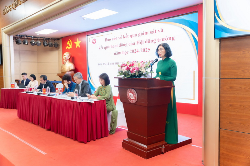 Tiếp nối chương trình, PGS, TS Lê Thị Thu Thủy đã trình bày Báo cáo về kết quả giám sát và kết quả hoạt động của Hội đồng trường năm học 2024-2025 ở các mặt công tác: Quyết nghị về chiến lược, các kế hoạch và quy chế của Nhà trường theo quy định; Quyết nghị về phương hướng, chính sách triển khai các hoạt động; Quyết nghị về cơ cấu tổ chức và công tác nhân sự theo quy định; Quyết nghị về chính sách tài chính, đầu tư và sử dụng cơ sở vật chất, công nghệ thông tin theo quy định; Triển khai hoạt động giám sát. Báo cáo nhận định, với sự chủ động, quyết liệt trong chỉ đạo của Chủ tịch Hội đồng trường, tinh thần trách nhiệm của các thành viên Hội đồng trường và sự phối hợp, hỗ trợ tích cực của Đảng ủy, Ban Giám hiệu, các tổ chức toàn thể và các đơn vị trong trường, về cơ bản Hội đồng trường đã hoàn thành tốt các chương trình công tác. Các nghị quyết của Hội đồng trường đã được Ban Giám hiệu tổ chức triển khai kịp thời, hiệu quả, góp phần giúp Nhà trường hoàn thành các nhiệm vụ và mục tiêu đề ra. Bên cạnh những kết quả đã đạt được, báo cáo cũng thẳng thắn chỉ ra một số vấn đề còn tồn tại, phân tích nguyên nhân và đề xuất giải pháp.