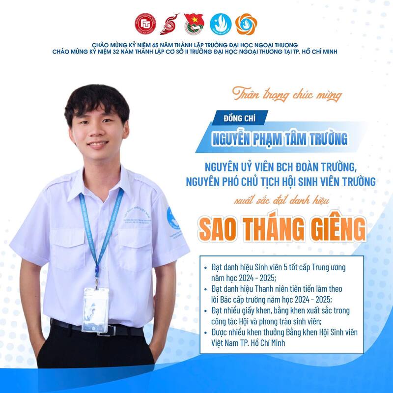 “Sao Tháng Giêng” là phần thưởng cao quý do Trung ương Hội Sinh viên Việt Nam trao tặng nhằm tôn vinh những sinh viên tiêu biểu - những cán bộ Đoàn - Hội luôn nỗ lực học tập, rèn luyện và không ngừng cống hiến cho cộng đồng sinh viên Việt Nam trong và ngoài nước. Đây là sự ghi nhận xứng đáng cho hành trình bền bỉ, tinh thần trách nhiệm cao cùng những dấu ấn nổi bật của đồng chí trong học tập, hoạt động phong trào và công tác Đoàn - Hội. Thành tích này không chỉ là niềm tự hào của cá nhân mà còn góp phần lan tỏa hình ảnh đẹp của sinh viên Ngoại Thương năng động, bản lĩnh và giàu nhiệt huyết.