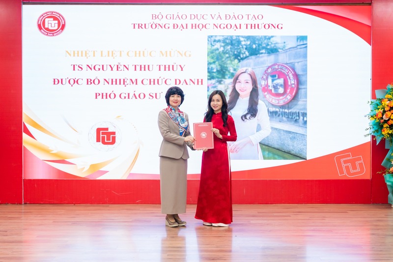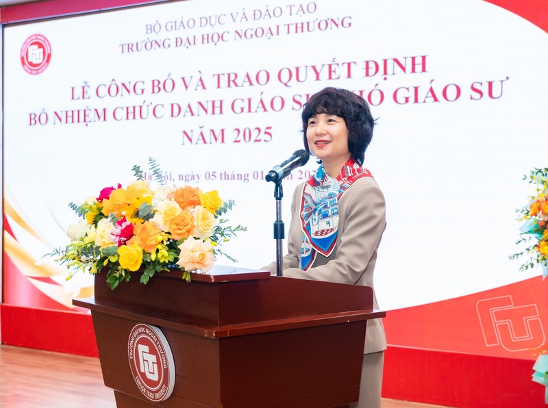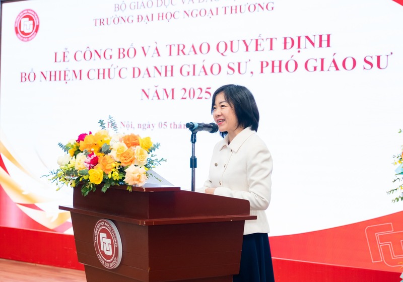 Phát biểu tại buổi lễ, PGS, TS Phạm Thu Hương nhiệt liệt chúc mừng các tân Giáo sư, tân Phó Giáo sư được bổ nhiệm chức danh ngày hôm nay. PGS, TS Phạm Thu Hương bày tỏ mong muốn rằng các thầy cô sẽ tiếp tục nuôi dưỡng chuyên môn, ngọn lửa với nghề, trở thành người dẫn dắt, góp phần nuôi dưỡng khát vọng của Trường Đại học Ngoại Thương.