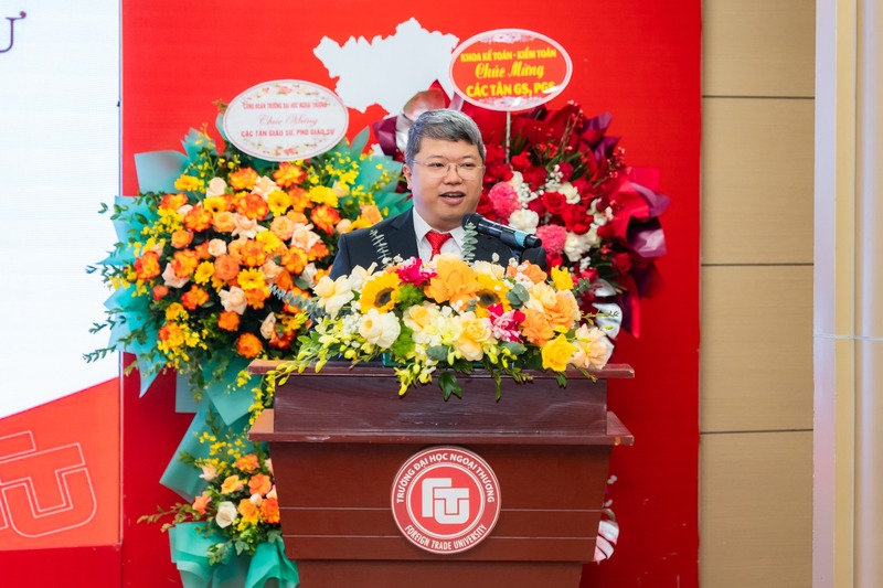 Đại diện cho các giảng viên được bổ nhiệm chức danh Giáo sư, Phó Giáo sư năm 2025, GS, TS Trần Quốc Trung - Phó Giám đốc Cơ sở II đã gửi lời cảm ơn chân thành và sâu sắc tới Đảng ủy, Hội đồng Trường, Ban Giám hiệu, các đơn vị chuyên môn, đồng nghiệp, gia đình và bạn bè đã luôn tạo điều kiện, đồng hành, ủng hộ và động viên trong suốt quá trình vừa qua. Nhận định vinh dự này là dấu mốc cho sự phát triển chuyên môn của mình, thầy chia sẻ tự hào là giảng viên Trường Đại học Ngoại Thương, cũng như cảm thấy trách nhiệm với Nhà trường, đóng góp quá trình phát triển chuyên môn của đơn vị, đóng góp chiến lược phát triển Nhà trường. Nhân dịp năm mới 2026, thầy Trung gửi chúc sức khoẻ và sự tri ân tới các thầy cô Nhà trường.
