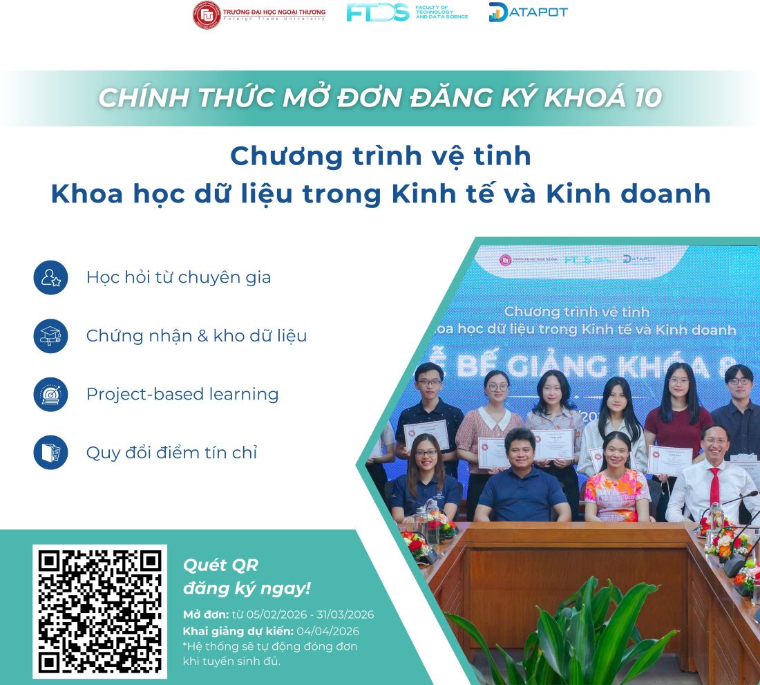 Nắm bắt được nhu cầu đó, Trường Đại học Ngoại Thương đã phối hợp với trung tâm Datapot Analytics Training xây dựng, tổ chức và đào tạo Chương trình vệ tinh “Khoa học dữ liệu trong Kinh tế và Kinh doanh”. Trở lại sau thành công của 9 khóa học, Chương trình FDC10 chính thức quay trở lại và đồng hành cùng sinh viên trên hành trình hiểu dữ liệu – làm chủ công cụ – ứng dụng vào các bài toán kinh tế và kinh doanh thực tế.