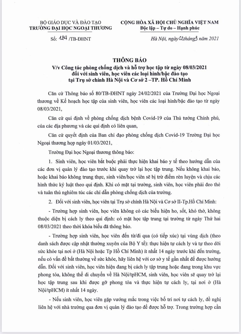 Thông báo về công tác phòng chống dịch và hỗ trợ học tập trung tại trường đại học Ngoại thương