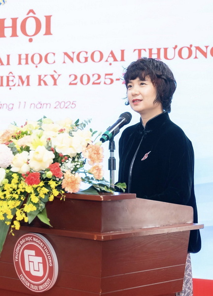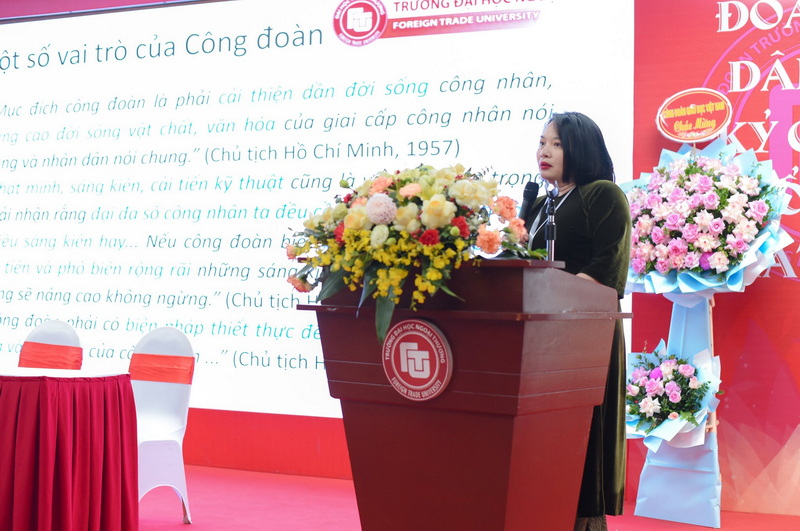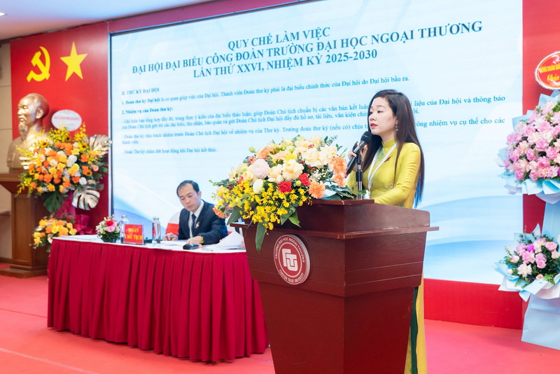 Trong phát biểu chỉ đạo Đại hội, PGS. TS Phạm Thu Hương – Bí thư Đảng uỷ, Hiệu trưởng Nhà trường khẳng định vai trò quan trọng của Công đoàn Trường ĐH Ngoại Thương trong hành trình xây dựng môi trường làm việc nhân văn và chuyên nghiệp, đồng thời ghi nhận sự chủ động, sáng tạo của Công đoàn trong chăm lo đời sống vật chất, tinh thần cho cán bộ, viên chức và người lao động. Đồng chí cũng giới thiệu dự án chăm sóc sức khỏe tinh thần “Chạm và Hiểu” của Nhà trường, kỳ vọng Công đoàn sẽ đồng hành để lan tỏa năng lượng tích cực trong toàn trường. Cũng nhân dịp này, PGS.TS Phạm Thu Hương bày tỏ lời cảm ơn sâu sắc tới Công đoàn Giáo dục Việt Nam đã luôn chỉ đạo và hỗ trợ hiệu quả, giúp Công đoàn Trường triển khai nhiều hoạt động mang bản sắc FTU; đồng thời mong muốn tiếp tục nhận được sự đồng hành sát sao trong thời gian tới. Kết thúc bài phát biểu, đồng chí đề nghị Đại hội phát huy dân chủ, nêu cao tinh thần trách nhiệm và lựa chọn các đại biểu có đủ phẩm chất, năng lực, uy tín tham gia Ban Chấp hành Công đoàn Trường nhiệm kỳ mới.
