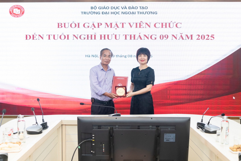Trân trọng gửi tặng viên chức nghỉ hưu kỷ niệm chương "Vì sự phát triển của trường ĐH Ngoại thương", PGS, TS Phạm Thu Hương chúc TS Tô Bình Minh bước sang một giai đoạn mới luôn dồi dào sức khỏe, vui vẻ, hạnh phúc và tiếp tục đóng góp vào sự phát triển chung của Nhà trường và đơn vị nơi thầy đã công tác trong những năm tới.