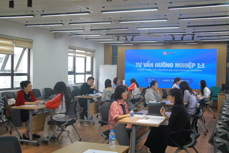 Sau buổi lễ, các thầy cô trong Mạng lưới Nhà đồng hành Hướng nghiệp thế hệ mới đã trực tiếp tham gia hoạt động Tư vấn hướng nghiệp 1:1 cho gần 100 sinh viên FTU. Chương trình được Trung tâm PEC triển khai hoàn toàn miễn phí cho toàn bộ sinh viên trong trường. Mỗi cuộc trò chuyện kéo dài 45-60 phút là một hành trình riêng, nơi các giảng viên Nhà trường giúp sinh viên nhận diện rõ hơn điểm mạnh - điểm yếu của bản thân, hiểu được ngành học phù hợp, hướng nghề tiềm năng và kỹ năng cần trau dồi thêm, cũng như xác định được bước tiếp theo: nên trải nghiệm ở lĩnh vực nào, cần học gì, chuẩn bị ra sao cho giai đoạn tới.