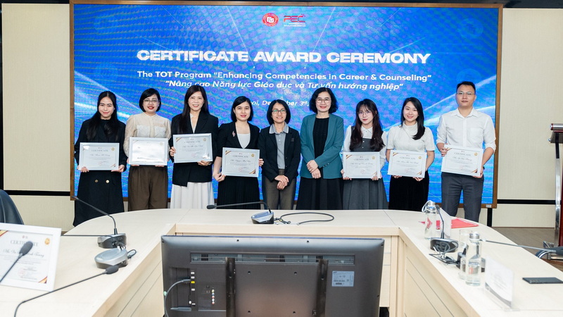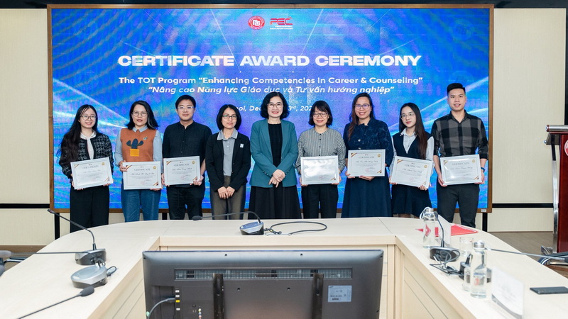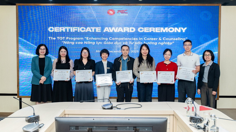 Ngày 03/12/2025, Trung tâm Thực hành Nghề nghiệp (PEC), Trường Đại học Ngoại Thương đã tổ chức Lễ trao chứng nhận “FTU - Nhà đồng hành hướng nghiệp thế hệ mới” dành cho các cán bộ, giảng viên hoàn thành Khóa đào tạo TOT03HN “Nâng cao năng lực giáo dục và tư vấn hướng nghiệp” tại Trụ sở chính Hà Nội.