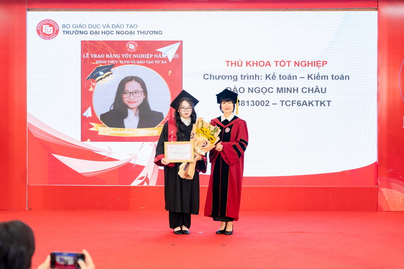 Cũng trong khuôn khổ buổi lễ, Nhà trường đã tuyên dương khen thưởng 01 Thủ khoa tốt nghiệp cùng các sinh viên tiêu biểu tốt nghiệp năm 2025. Buổi lễ khép lại với nghi thức trao bằng tốt nghiệp trang trọng tới từng tân cử nhân, dưới sự chứng kiến, chúc mừng của các thầy cô Khoa/ Viện chuyên môn cùng người thân và gia đình.