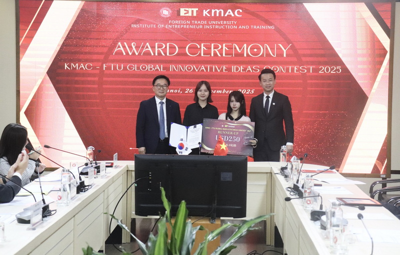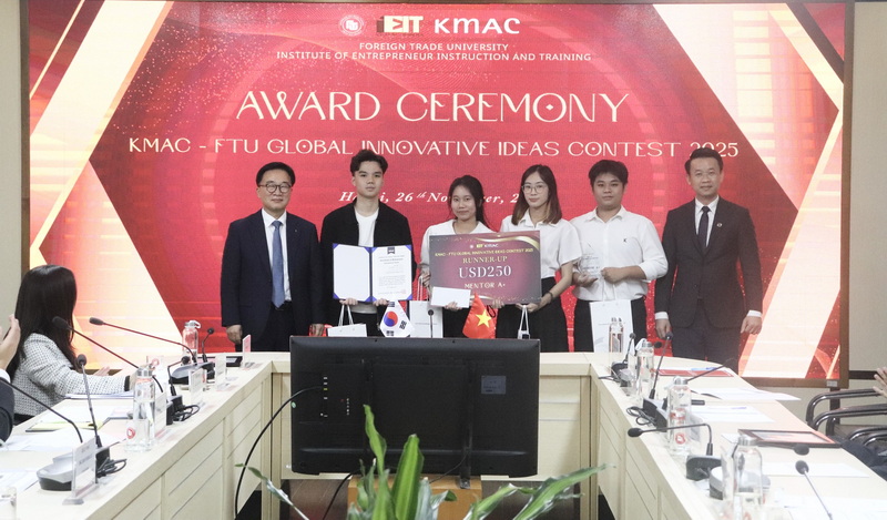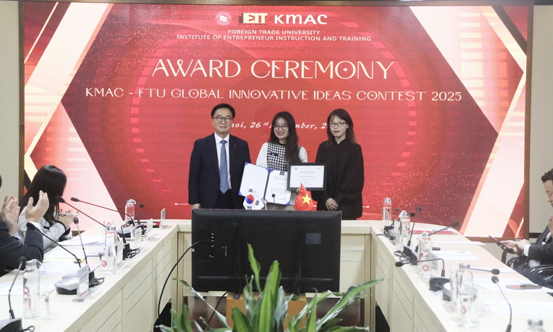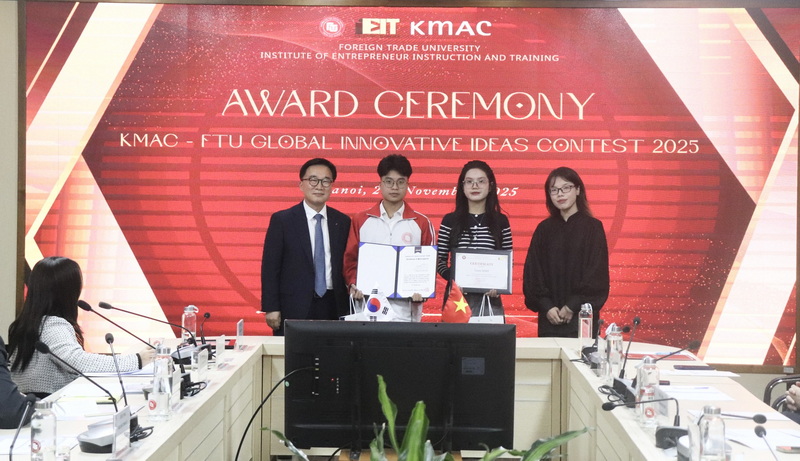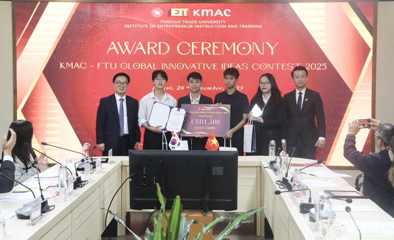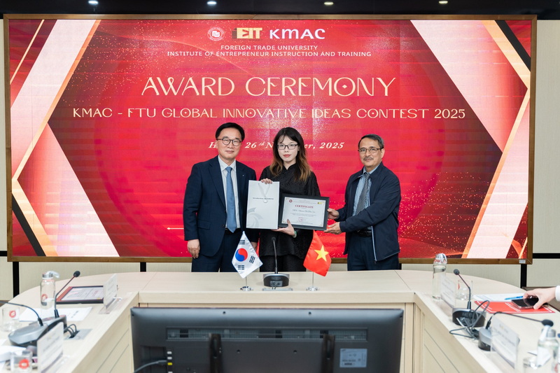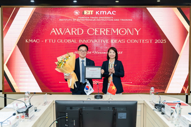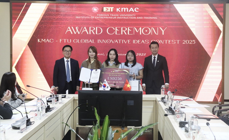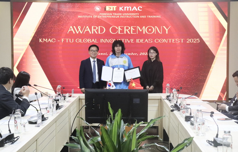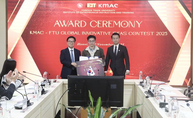 Ngày 26/11/2025, Viện Đào tạo và tư vấn Doanh nghiệp, Trường ĐH Ngoại Thương đã phối hợp với Công ty Tư vấn Quản lý Hàn Quốc (KMAC) tổ chức Lễ trao giải cuộc thi “KMAC – FTU Ý tưởng đổi mới sáng tạo toàn cầu 2025”, khép lại hành trình hơn 2 tháng tranh tài của các đội thi đầy tiềm năng đến từ 19 Đại học và Trường đại học hàng trên cả nước.
