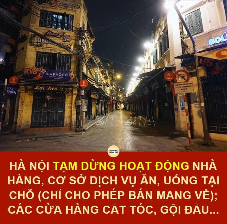 Tạm dừng hoạt động một số cơ sở kinh doanh dịch vụ để đảm bảo phòng, chống dịch bệnh COVID-19 đến khi có thông báo mới của Thành phố, cụ thể: Nhà hàng, cơ sở dịch vụ ăn, uống tại chỗ (chỉ cho phép bán hàng mang về), không tổ chức ăn uống, liên hoan tập trung đông người; các cửa hàng cắt tóc, gội đầu.