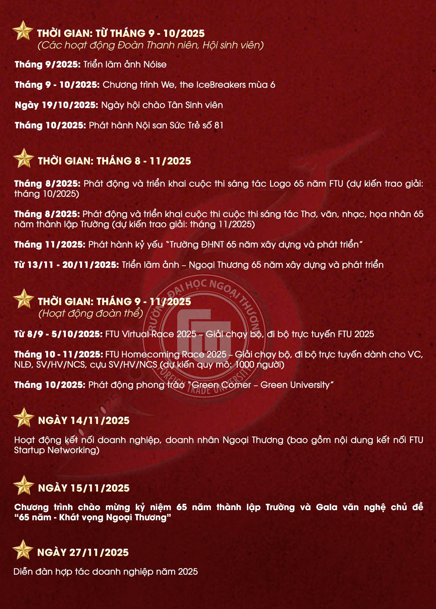 CHƯƠNG TRÌNH TỔNG THỂ CÁC HOẠT ĐỘNG KỶ NIỆM 65 NĂM THÀNH LẬP TRƯỜNG Kỷ niệm 65 năm Previous Article Hồ sơ mời tài trợ 65 năm thành lập Trường Đại học Ngoại thương (1960-2025) Next Article Trường ĐH Ngoại thương phát động Giải chạy bộ và đi bộ trực tuyến “FTU Homecoming Race 2025” CHƯƠNG TRÌNH TỔNG THỂ CÁC HOẠT ĐỘNG KỶ NIỆM 65 NĂM THÀNH LẬP TRƯỜNG Previous Article Hồ sơ mời tài trợ 65 năm thành lập Trường Đại học Ngoại thương (1960-2025) Next Article Trường ĐH Ngoại thương phát động Giải chạy bộ và đi bộ trực tuyến “FTU Homecoming Race 2025”