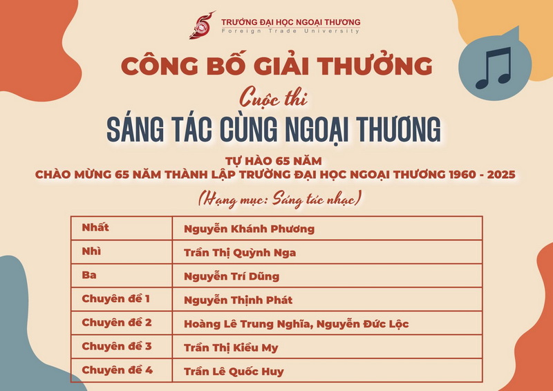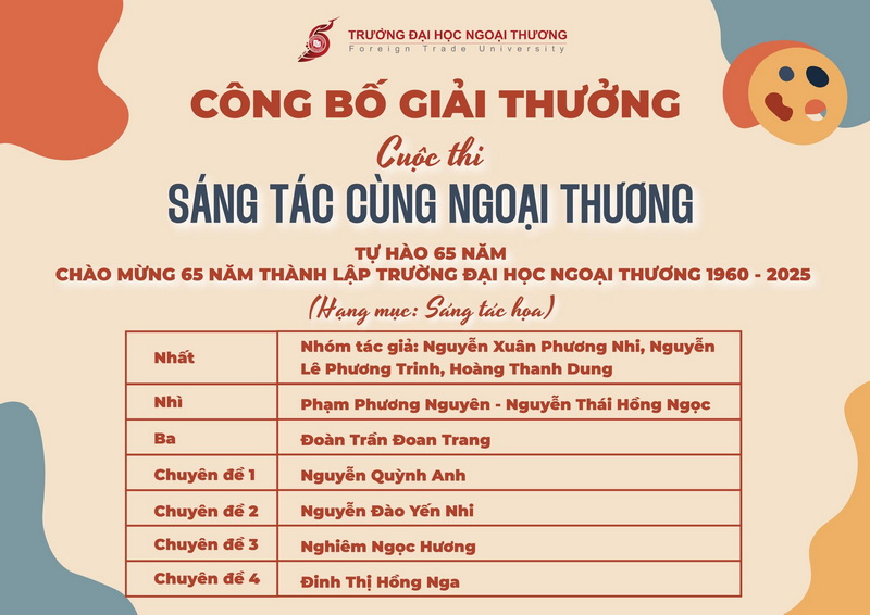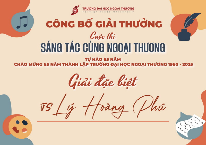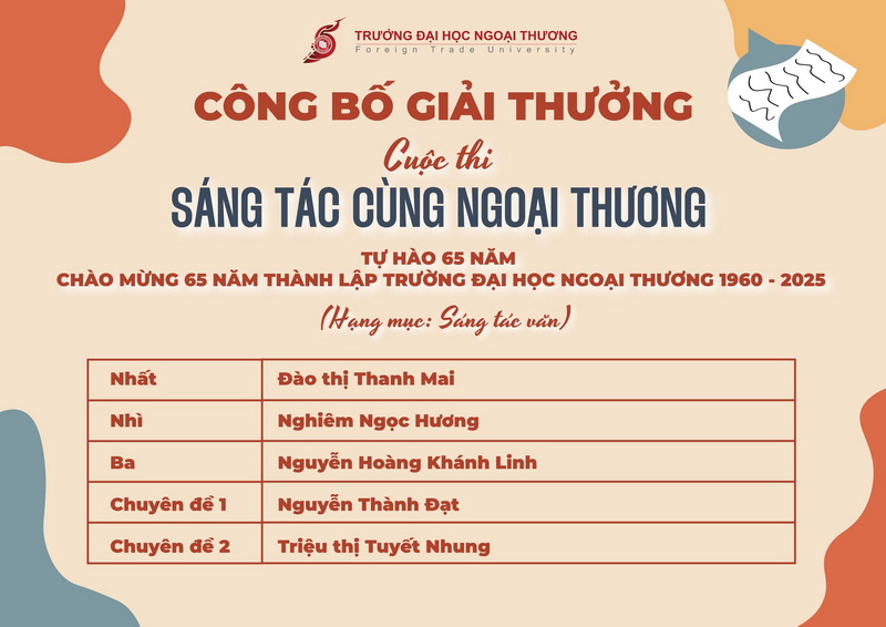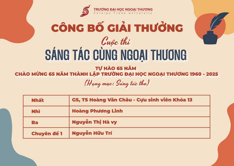 Xin chúc mừng tất cả các thí sinh đạt giải của cuộc thi sáng tác cùng Ngoại thương - Tự hào 65 năm chào mừng kỉ niệm 65 năm ngày thành lập trường