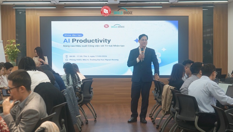 Ngày 17/3/2026, Phòng Tổ chức Nhân sự, Trường Đại học Ngoại Thương, cùng với sự hỗ trợ của Trung tâm Thực hành Nghề nghiệp PEC, phối hợp cùng Công ty TNHH Skills Bridge đã tổ chức thành công Khóa đào tạo 01 AI Productivity: Nâng cao hiệu suất công việc với Trí tuệ nhân tạo.