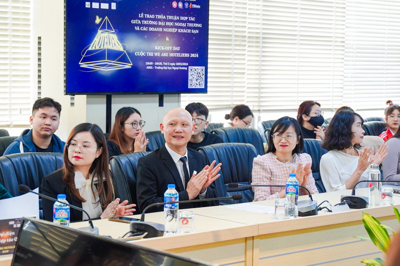 Về phía Trường ĐH Ngoại Thương có PGS, TS Phạm Thu Hương - Phó Hiệu trưởng Nhà trường; PGS, TS Lê Thái Phong - Trưởng Khoa Quản trị kinh doanh; ThS Đào Thị Thu Hà - Phó Trưởng phòng Hợp tác Quốc tế; các cán bộ, giảng viên, sinh viên Nhà trường và các bạn trẻ quan tâm đăng ký tham gia cuộc thi "We are Hoteliers 2024". Phát biểu khai mạc buổi lễ, PGS, TS Phạm Thu Hương khẳng định buổi lễ trao biên bản ghi nhớ hợp tác là minh chứng cho sự nỗ nỗ lực của Nhà trường trong việc xây dựng mạng lưới các doanh nghiệp đối tác trong lĩnh vực khách sạn, góp phần cung cấp nguồn nhân lực đáp ứng yêu cầu trong lĩnh vực này.