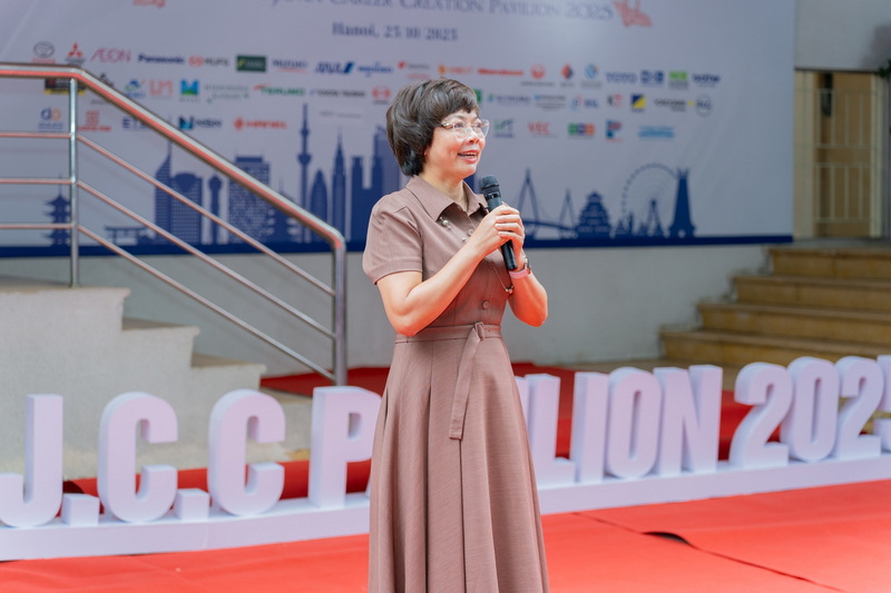 Trong bài phát biểu của mình, PGS, TS Vũ Thị Hiền – Phó Hiệu trưởng Nhà trường nhấn mạnh ý nghĩa của sự kiện diễn ra trong không khí hân hoan hướng tới kỷ niệm 65 năm Trường ĐH Ngoại Thương. Đây là ngày hội kết nối việc làm quy mô do Viện VJCC, Trường ĐH Ngoại Thương, JCCI và JICA phối hợp tổ chức, thể hiện mối quan hệ Đối tác Chiến lược Toàn diện Việt Nam – Nhật Bản. Cô khẳng định V.J.C.C Pavilion 2025 là hoạt động tiêu biểu của hệ sinh thái Doanh nghiệp – Nhà trường – Người học, thúc đẩy đổi mới sáng tạo và hội nhập quốc tế. Với sứ mệnh đào tạo công dân toàn cầu, Trường ĐH Ngoại Thương mong muốn sự kiện không chỉ là nơi tuyển dụng mà còn là diễn đàn chia sẻ tri thức và truyền cảm hứng nghề nghiệp cho sinh viên. Cô cũng mong muốn thông qua sự kiện lần này, sinh viên sẽ chủ động giao tiếp, học hỏi và nắm bắt cơ hội nghề nghiệp trong kỷ nguyên hiện đại hoá của đất nước. Khép lại bài phát biểu của mình, PGS, TS Vũ Thị Hiền cũng không quên gửi lời tri ân tới các đối tác Nhật Bản và Việt Nam, đồng thời cam kết tiếp tục mở rộng các hoạt động hợp tác quốc tế, xây dựng môi trường học tập sáng tạo và bền vững cho sinh viên.