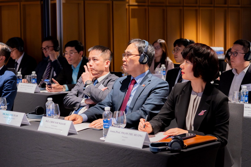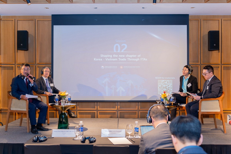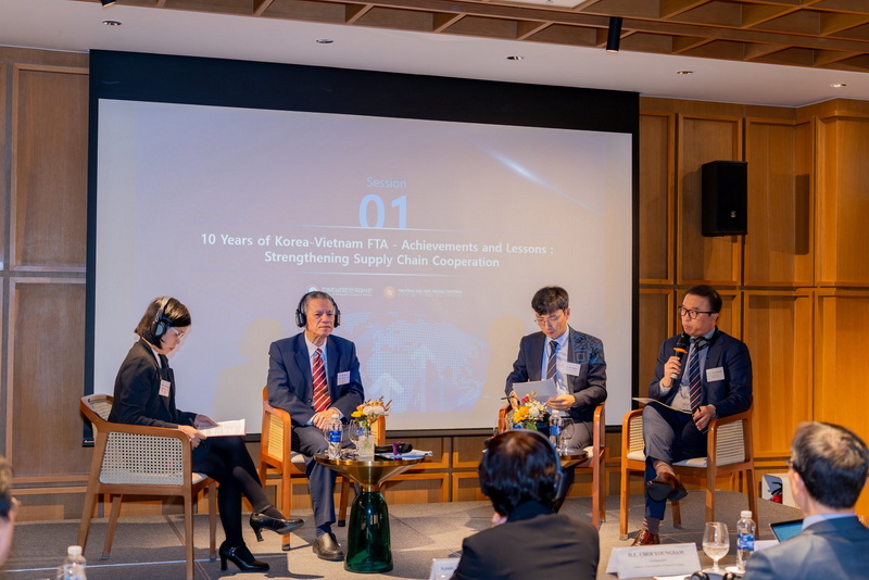 Phiên thảo luận bàn tròn với sự tham gia của PGS. TS. Trịnh Thị Thu Hương – Giám đốc Chương trình WTO Chair tại trường ĐH Ngoại Thương; ông Ngô Khắc Lê – Phó Tổng thư ký, Hiệp hội doanh nghiệp Logistics Việt Nam; GS. Ryu Yongwook – Trường Chính sách Công Lý Quang Diệu (LKYSPP) và TS. Kim Bawoo, Samsung Electronics đã đi sâu vào tác động của VKFTA đối với thương mại – đầu tư song phương, ảnh hưởng của chính sách thuế quan Hoa Kỳ, xu hướng bảo hộ mới và sự dịch chuyển chuỗi cung ứng toàn cầu. Các diễn giả cũng phân tích những rào cản lớn đối với doanh nghiệp Việt Nam trong tham gia chuỗi cung ứng Hàn Quốc – từ năng lực công nghiệp hỗ trợ, logistics đến yêu cầu về tiêu chuẩn kỹ thuật, quản trị và khả năng đáp ứng ESG. Phiên thảo luận kết thúc với các gợi mở về nâng cấp VKFTA, thúc đẩy liên kết chuỗi cung ứng, phát triển logistics, đổi mới sáng tạo và tăng cường năng lực doanh nghiệp Việt Nam để tận dụng hiệu quả bối cảnh “friend-shoring”, đa dạng hóa chuỗi cung ứng trong giai đoạn mới.