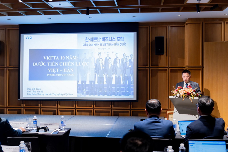 Trong phần phát biểu dẫn đề, TS. Đậu Anh Tuấn – Phó Tổng thư ký kiêm Trưởng Ban Pháp chế VCCI – đã phác họa bức tranh toàn cảnh về thương mại và đầu tư Việt Nam – Hàn Quốc sau 10 năm thực thi VKFTA, nhấn mạnh những thành tựu tăng trưởng ấn tượng trong trao đổi hàng hóa, đầu tư FDI và mức độ gắn kết ngày càng sâu của doanh nghiệp hai nước trong chuỗi cung ứng khu vực. Ông cũng chia sẻ góc nhìn từ cộng đồng doanh nghiệp về lợi ích mà các FTA mang lại, từ cắt giảm thuế quan, thuận lợi hóa thương mại đến cải thiện năng lực cạnh tranh, đồng thời chỉ ra các hạn chế trong việc tận dụng ưu đãi và nhu cầu tăng cường hỗ trợ kỹ thuật. Trên cơ sở bối cảnh địa chính trị và kinh tế toàn cầu biến động mạnh, TS. Đậu Anh Tuấn đề xuất yêu cầu nâng cấp hợp tác, mở rộng phạm vi FTA, thúc đẩy đổi mới sáng tạo, chuyển đổi xanh – số và tiếp tục đồng hành cùng doanh nghiệp nhằm khai thác hiệu quả hơn các cơ hội mà VKFTA và mạng lưới FTA mang lại.