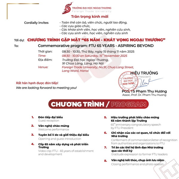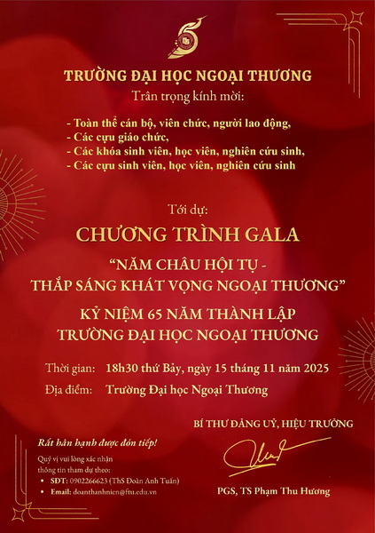 Vui lòng theo dõi thêm các chương trình chào mừng kỷ niệm 65 năm thành lập Trường Đại học Ngoại Thương tại: https://ftu.edu.vn/ky-niem-65-nam