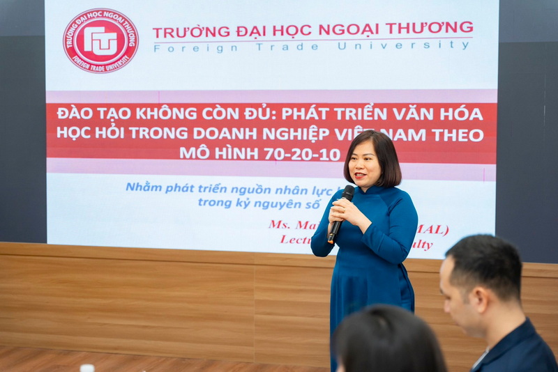 Tiếp theo, ông Phạm Quang Tú – Giám đốc điều hành Prep.Vn – mang đến bài tham luận “Thực tế về tuyển dụng, đào tạo, và định hướng sử dụng ngoại ngữ cho nhân viên trong doanh nghiệp đa quốc gia”. Từ kinh nghiệm thực tế, diễn giả đã phân tích nhu cầu sử dụng ngoại ngữ trong môi trường làm việc quốc tế, đồng thời đề xuất các định hướng đào tạo phù hợp với yêu cầu tuyển dụng hiện nay Bà Nguyễn Việt Anh – Phó Giám đốc Vietnam France Exchange – tiếp tục chương trình với bài tham luận “Giao tiếp định hướng mục tiêu trong doanh nghiệp: Yếu tố thành công và rủi ro tiềm ẩn”. Diễn giả đã chỉ ra những yếu tố then chốt trong giao tiếp nội bộ, đồng thời cảnh báo các rủi ro tiềm ẩn có thể ảnh hưởng đến hiệu quả vận hành của tổ chức Khép lại chuỗi tham luận, Thạc sĩ Mai Hữu Hạnh – Giảng viên Khoa Tiếng Anh Chuyên ngành – trình bày bài viết “Phát triển văn hóa học tập trong doanh nghiệp Việt Nam thông qua mô hình 70–20–10”. Bài tham luận giới thiệu mô hình đào tạo hiện đại, đồng thời đề xuất cách áp dụng vào thực tiễn doanh nghiệp nhằm thúc đẩy văn hóa học tập và phát triển năng lực nội bộ Bên cạnh các phần trình bày chuyên môn, hội thảo cũng dành thời gian tri ân các diễn giả, các đơn vị hỗ trợ và Ban Biên tập kỷ yếu – những cá nhân và tập thể đã góp phần quan trọng vào thành công của chương trình.