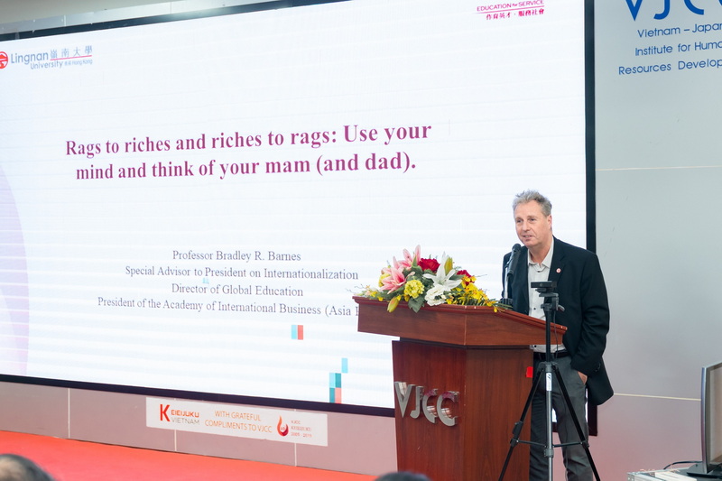 Giáo sư Bradley R. Barnes - Phó Hiệu trưởng, Giám đốc Giáo dục toàn cầu, Đại học Lĩnh Nam, Hồng Kông với bài tham luận "Rags to riches and riches to rags (Từ nghèo trở nên giàu có và từ giàu có trở nghèo)". Giáo sư đã kể lại một vài giai thoại về cuộc sống của mình, đồng thời liên hệ với các lý thuyết về động lực học để từ đó thấy được các hướng xây dựng và phát triển mô hình kinh doanh bền vững của doanh nghiệp. Việc ứng dụng các lý thuyết động lực mang lại một góc nhìn lý thuyết hữu ích để hiểu vì sao và bằng cách nào các tổ chức theo đuổi các mô hình kinh doanh hướng tới phát triển bền vững. Tổng thể, các lý thuyết động lực giúp giải thích mối quan hệ tương tác giữa động lực cá nhân, tổ chức và thể chế trong tiến trình phát triển bền vững, từ đó cung cấp cơ sở khoa học để thiết kế và quản trị mô hình kinh doanh bền vững hướng tới tương lai toàn diện và bền vững.