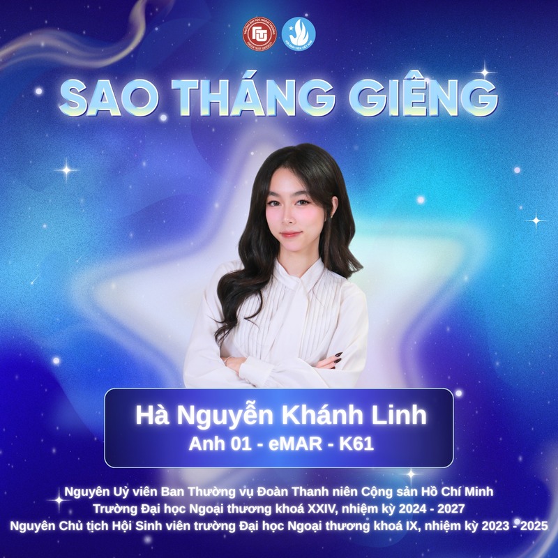 “Sao Tháng Giêng” là phần thưởng cao quý do Trung ương Hội Sinh viên Việt Nam trao tặng nhằm tôn vinh những sinh viên tiêu biểu - những cán bộ Đoàn - Hội luôn nỗ lực học tập, rèn luyện và không ngừng cống hiến cho cộng đồng sinh viên Việt Nam trong và ngoài nước. Đây là sự ghi nhận xứng đáng cho hành trình bền bỉ, tinh thần trách nhiệm cao cùng những dấu ấn nổi bật của đồng chí trong học tập, hoạt động phong trào và công tác Đoàn - Hội. Thành tích này không chỉ là niềm tự hào của cá nhân mà còn góp phần lan tỏa hình ảnh đẹp của sinh viên Ngoại Thương năng động, bản lĩnh và giàu nhiệt huyết.