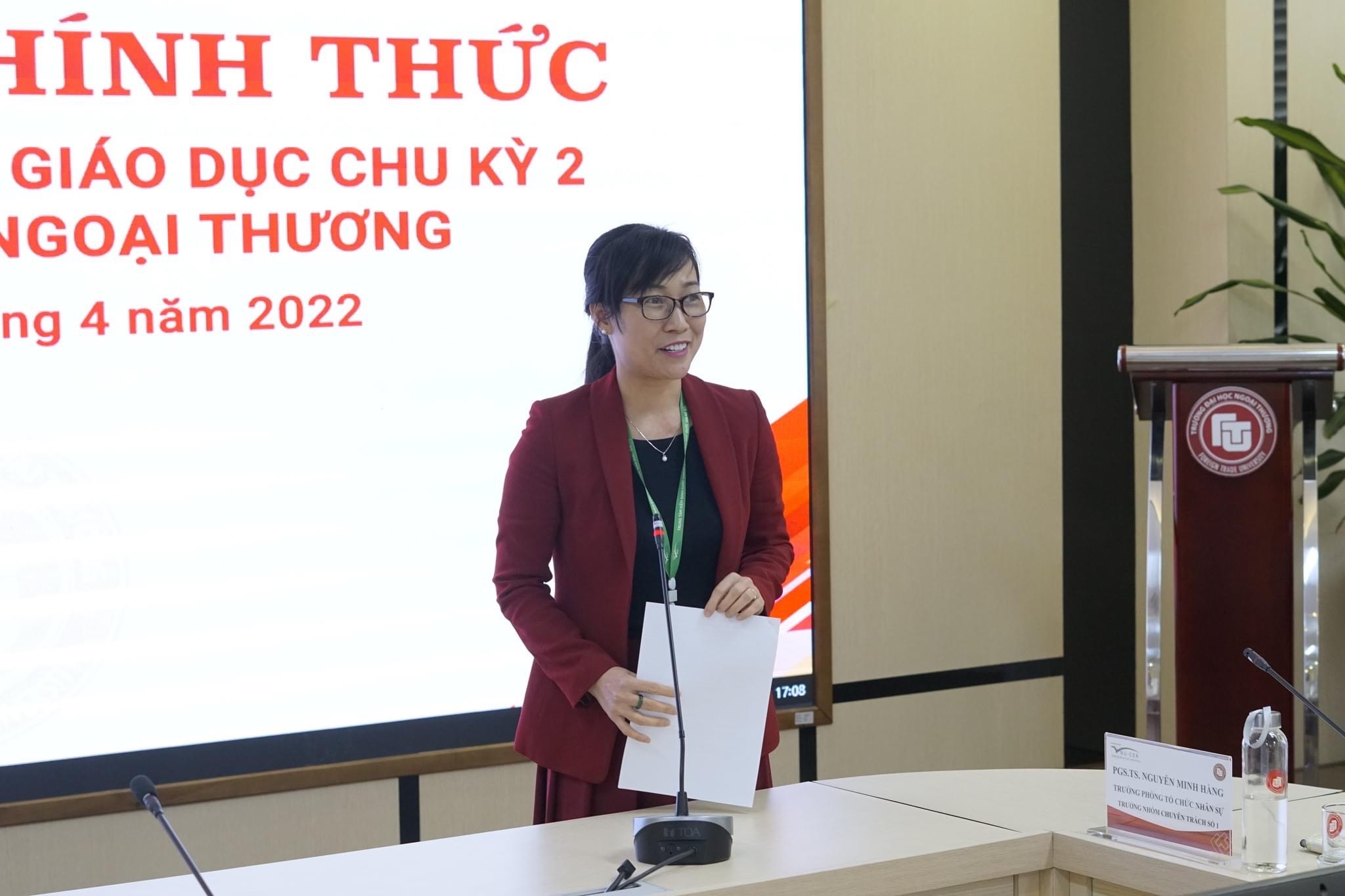 Phát biểu tại buổi lễ, TS. Tạ Thị Thu Hiền đánh giá cao những nỗ lực chuẩn bị khẩn trương, chu đáo cũng như tinh thần cầu thị, trách nhiệm của Nhà trường trong đợt kiểm định lần này. Cô cho biết, đoàn chuyên gia đánh giá ngoài đã ghi nhận rất nhiều cải tiến vượt bậc của Nhà trường kể từ sau đợt kiểm định chu kỳ 1 vào năm 2016. Cô cho biết, đoàn chuyên gia đánh giá ngoài đã làm việc khoa học, công tâm, khách quan với trách nhiệm cao nhất trong suốt hơn 1 tháng kể từ khi tiếp cận báo cáo hơn 500 trang cùng hơn 200 trang danh mục minh chứng cho đến phiên khảo sát chính thức với 10 phiên phỏng vấn tất cả các đối tượng liên quan và tham quan cơ sở vật chất của Nhà trường ở cả 3 cơ sở đào tạo để có thể cho ra một báo cáo kết quả sơ bộ trong phiên bế mạc này. Cuối cùng, cô cũng gửi lời cảm ơn Nhà trường đã phối hợp rất chặt chẽ, nhịp nhàng, tạo điều kiện cho đoàn chuyên gia đánh giá ngoài hoàn thành tốt nhiệm vụ.