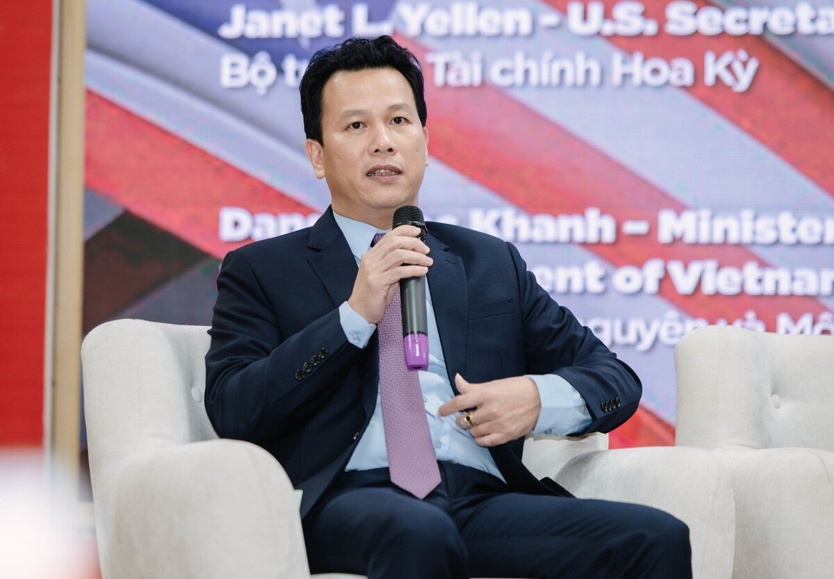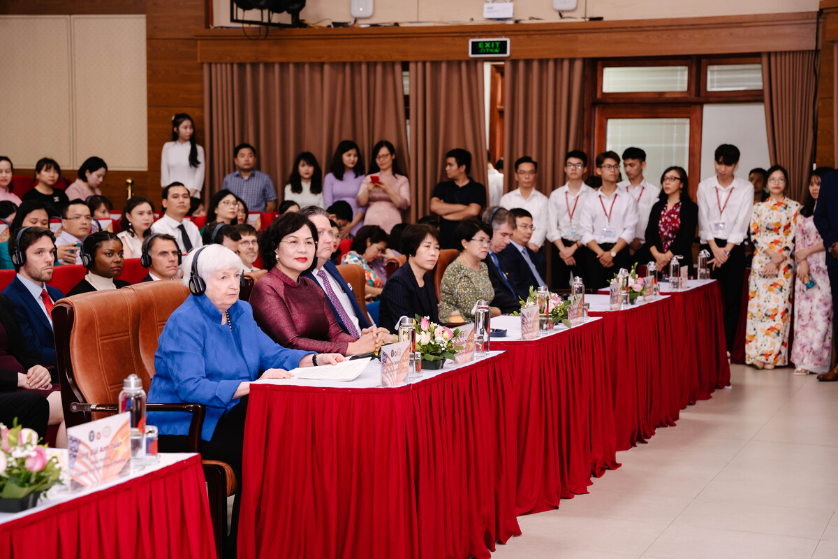 Các diễn giả tham gia Hội nghị gồm: Bà Janet Yellen - Bộ trưởng Tài chính Hoa kỳ, Bà Nguyễn Thị Hồng - Thống đốc Ngân hàng Nhà nước Việt Nam (NHNN), Ông Đặng Quốc Khánh - Bộ trưởng Bộ Tài nguyên và Môi trường (TN&MT)và Ông Bùi Anh Tuấn - Hiệu trưởng Trường ĐH Ngoại thương đã chia sẻ các quan điểm và khuyến nghị chính sách để tăng cường hợp tác nhằm giải quyết các thách thức toàn cầu về kinh tế và biến đổi khí hậu.