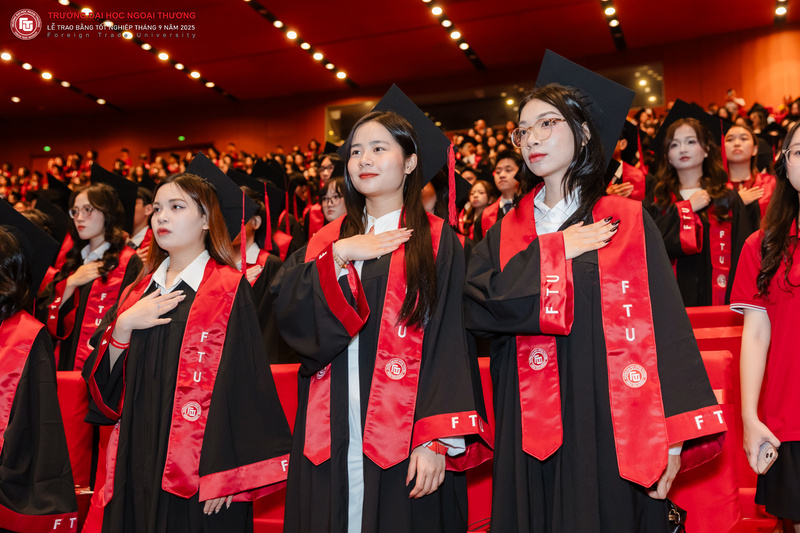 Khép lại buổi lễ, toàn thể hội trường đã cùng hòa ca trong giai điệu quen thuộc của ca khúc “Người Ngoại thương”. Tiếng hát vang lên không chỉ là lời chào tạm biệt mái trường, mà còn là lời hứa của mỗi tân cử nhân: dù rời xa giảng đường, nhưng trong mỗi tân cử nhân vẫn mãi mang trong mình tinh thần Ngoại Thương.