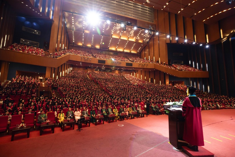 Đại diện các tân cử nhân tốt nghiệp đợt này, Nguyễn Thị Kim Oanh - Lớp Anh 01 JIB - K60 Viện Phát triển Nguồn Nhân lực Việt Nam - Nhật Bản (Viện VJCC), Thủ khoa tốt nghiệp chương trình Cử nhân Kinh doanh quốc tế theo mô hình tiên tiến Nhật Bản, đồng thời là Sinh viên tốt nghiệp tiêu biểu toàn khóa K60, với điểm GPA 3,96/4.0 và tổng Điểm Đánh giá kết quả rèn luyện đạt 95,5/100 phát biểu tại buổi lễ.