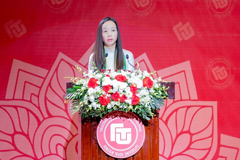 Phát biểu tại buổi lễ, PGS, TS Phạm Thu Hương - Hiệu trưởng Trường Đại học Ngoại Thương đã nhiệt liệt biểu dương những thành tích học tập, rèn luyện của tất cả sinh viên được trao bằng tốt nghiệp đợt này. Cô Hiệu trưởng nhắn nhủ, “Với vai trò của người đi trước, cô mong muốn chia sẻ với các em rằng bất cứ con đường sự nghiệp nào mang lại giá trị cho cuộc sống đều trân quý và hành trình để đạt được những thành tựu trên con đường đó đều cần rất nhiều nỗ lực và công sức. Các em hãy “biết ước mơ và hiểu được ước mơ của mình” để dám dấn thân đối mặt với thử thách trên hành trình trưởng thành và cũng để hiểu được mình sẽ đi tới đâu và sẽ đi như thế nào. Các em hãy “dành sự lắng nghe mỗi khi có thể” bởi chính sự lắng nghe ấy là cách thể hiện tình cảm chân thành nhất, là cách giúp chúng ta nhận được sự yêu thương nhiều nhất và cũng là cách thiết lập hệ sinh thái phát triển cá nhân hiệu quả nhất. Các em cũng đừng quá lo lắng với con đường mà mình đã lựa chọn hay sẽ phải lựa chọn, hãy “đặt niềm tin vào bản thân”, tin vào khả năng đương đầu với mọi thử thách của mình, và hãy luôn “giữ một tinh thần vững chãi” để đón nhận bất cứ điều gì có thể xảy ra trên con đường mà mình đã lựa chọn hay sẽ phải lựa chọn để không lỗi hẹn với những cơ hội của cuộc đời mình. Các em hãy “biết chấp nhận và học hỏi từ sự thất bại” và hãy hiểu rằng đó là chúng ta “chưa thành công”, hãy đón nhận điều đó như là những cơ hội để rèn luyện và trưởng thành, để chúng ta lại trở nên mạnh mẽ và bền bỉ hơn trên hành trình chinh phục các mục tiêu của cuộc đời”.