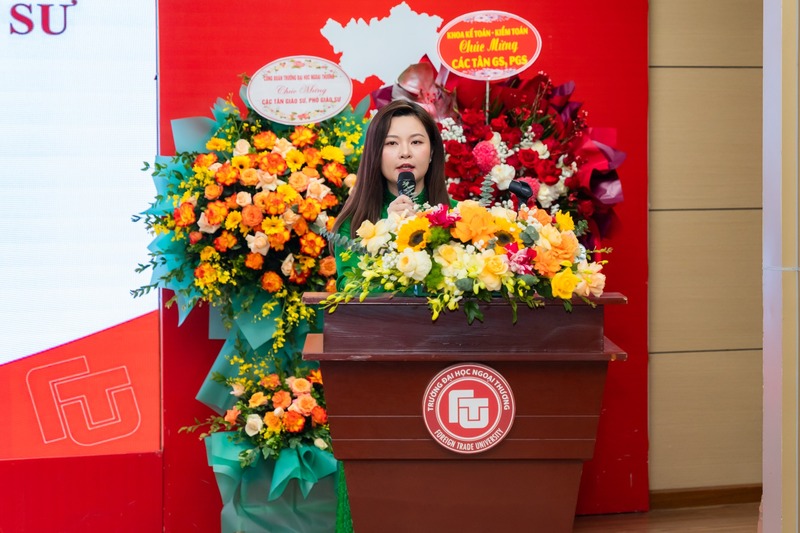 Phát biểu tại buổi lễ, PGS, TS Phạm Thu Hương nhiệt liệt chúc mừng các tân Giáo sư, tân Phó Giáo sư được bổ nhiệm chức danh ngày hôm nay. PGS, TS Phạm Thu Hương bày tỏ mong muốn rằng các thầy cô sẽ tiếp tục nuôi dưỡng chuyên môn, ngọn lửa với nghề, trở thành người dẫn dắt, góp phần nuôi dưỡng khát vọng của Trường Đại học Ngoại Thương.