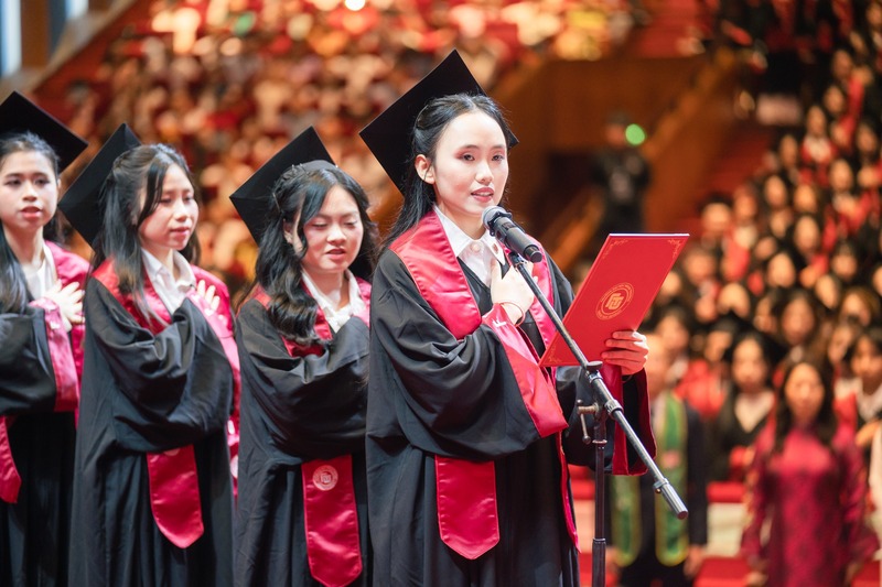 Đại diện cho các tân cử nhân tốt nghiệp đợt này, sinh viên Lương Tùng Chi - Chương trình chất lượng cao kinh tế đối ngoại với Tổng điểm kết quả học tập toàn khoá đạt 3,98/4,0 và Tổng điểm Đánh giá kết quả rèn luyện toàn khóa đạt 96/100 đã bày tỏ niềm vinh dự khi được đại diện cho các tân cử nhân tốt nghiệp đợt 1 năm 2026 chia sẻ cảm xúc cũng như gửi lời tri ân tới thầy cô và gia đình tại buổi lễ. Nhìn lại chặng đường gần 4 năm đại học với nhiều nỗ lực, Tùng Chi nhận định rằng điều soi đường cho mỗi người trên chặng đường phía trước không nên là hào quang thành công của người khác, mà phải là những giá trị bản thân thực sự tin tưởng. Bài phát biểu gửi gắm tinh thần sống sâu sắc, biết quay về lắng nghe chính mình, bền bỉ theo đuổi ước mơ, giữ sự kiên định trước thử thách và trưởng thành từ nội lực được vun đắp bởi gia đình, thầy cô và môi trường học tập tại Trường Đại học Ngoại Thương.
